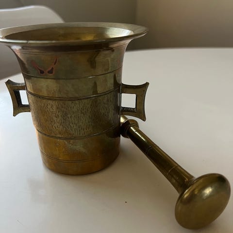 Posliininen huhmare eli mortteli ja siihen kuuluva survin.