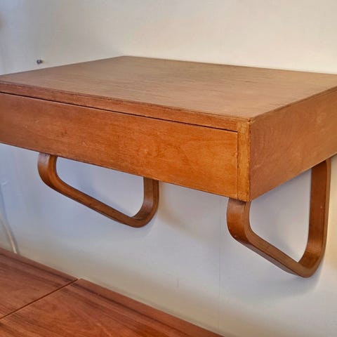 Artek-seinäkonsoli kahdella laatikolla, klassinen malli 114A, suunnittelija Alvar Aalto.