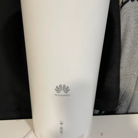 Huawei/DNA wifi-reititin valkoisella värillä ja kahdella antennilla. Sisältää virtalähteen ja tarjoaa langattoman verkon yhteyden.