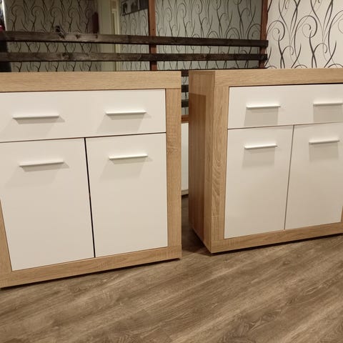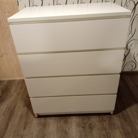 Hyväkuntoinen lipasto neljällä vetolaatikolla. Ei murtumia/lohkeillu paloja. Valkoiset osat korkeakiiltoiset.