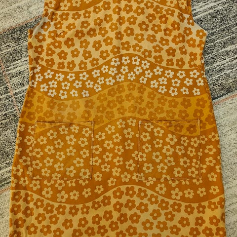 Ihanan värikäs kesäinen kukkamekko 60-/70-luvulta. Alaspäin levenevä helma. Valkoisella pohjalla keltaisen, ruskean ja mustan sävyjä. Materiaali hiukan valossa hohtavaa keinokuitua/sekoitetta, ei jousta. Kokoarvio noin M/L (kainalo-kainalo noin 52 cm).