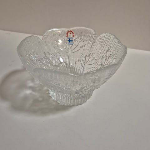 Suunnittelija Pertti Kallioinen, Mäntsälän lasisepät. Korkeus 7.5 cm, halkaisija 12.5 cm, ehjä, pieni käytön jälki pohjassa, muutoin erittäin hyvä. Soveltuu koriste- tai tarjoilukäyttöön.