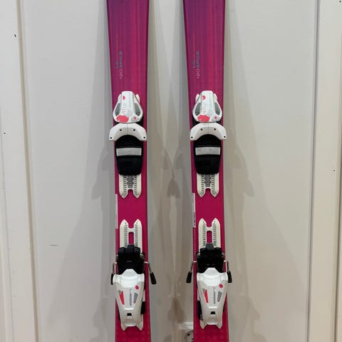 Lasten Elan Lil' Magic skimbat, design tyttöjen mieleen. Helposti säädettävät Elanin siteet. Nyt suojavoiteet päällä, siklausta vaille valmiit mäkeen.
