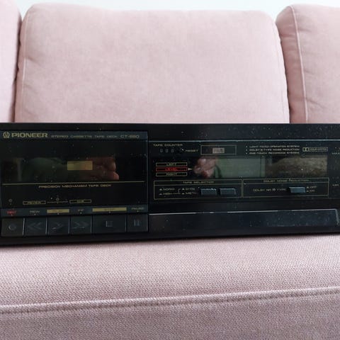 Pioneerin kasettidekki. Vaatii ainakin uudet hihnat. Toinen pesä pyöritti hetken, ennen kuin hihna katkesi. Toisesta se oli jo valmiiksi poikki. Pohjasta puuttuu tassut.