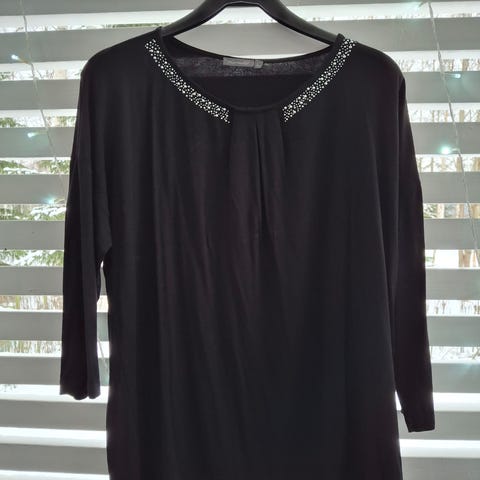 -harmaa neulottu pusero, puuvilla-pellavaa. Yläosa ja hihat neulottu harvemmaksi. Pituus olalta helmaan 60 cm. Leveys kainalosta kainaloon 55 cm.