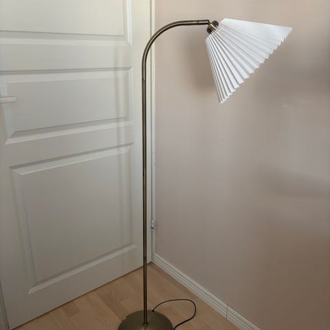 Messinkinen hyväkuntoinen ja toimiva jalkalamppu. Kaksi valolähdettä, jotka voi sytyttää yksitellen tai yhtäaikaa. Helpot suunnata haluttuun kohtaan. Tunnelmallinen ja samalla erinomainen lukulamppu. Jalassa pintanaarmuja.