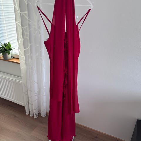 Punainen mekko, koko 36/S. Mekossa on lyhyet hihat, vinohelma ja koristeellinen yksityiskohta vyötäröllä.