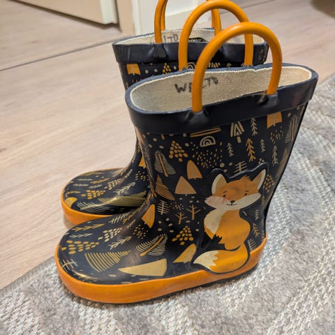 Vuorelliset kumisaappaat koossa 26/27. Hyväkuntoiset, hieman käytön jälkiä.