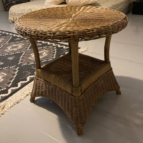 Rottinki ruokailuryhmä, johon kuuluu pyöreä pöytä ja neljä tuolia. Tuolit on varustettu mustapohjaisilla, kuvioiduilla istuinpehmusteilla. Ryhmä soveltuu sisäkäyttöön ja tarjoaa luonnonläheisen ilmeen ruokailutilaan. Pehmusteet ehjät ja siistit, mutta helppo vaihtaa uusiin.
