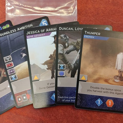 Architects, Paladins & Viscounts of the West Kingdom trilogiaan ja Raiders of the North Sea peliin promokortteja. Kortit ollut sleeveissä eli on kun pakasta vedettyjä. Paladins pelin korttteihin oon tehnyt tussilla merkintöjä (näkee kuvista), jotta värisokea kaverini saa korteista selvää, ei pitäisi haitata peliä.