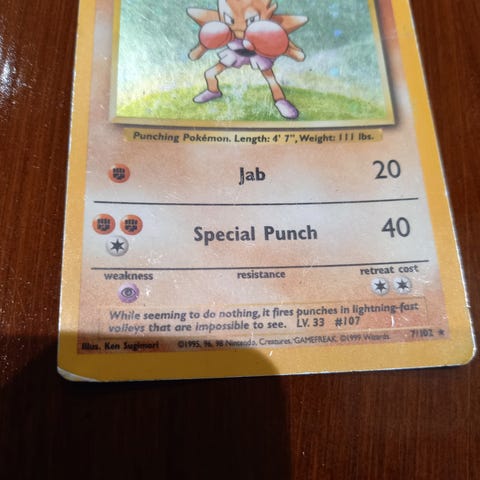 Myydään Pokemonin ensimmäisen Base Set sarjan Hitmonchan 7/102 holo pokemon-kortti.
