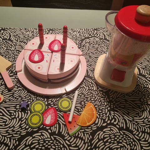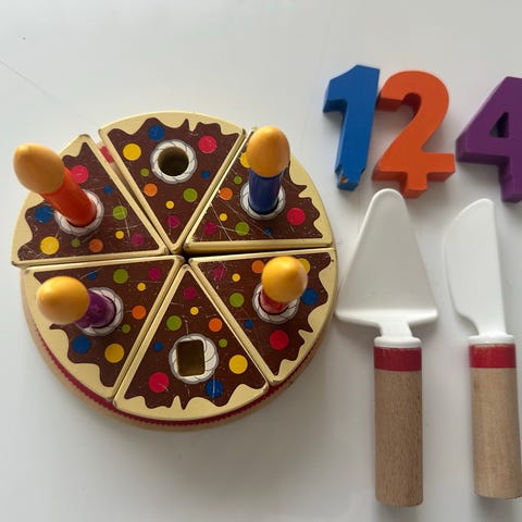 Kaksikerroksinen kakku, josta voi tarjoilla muhkeita paloja vieraille. Kakussa kynttilä, jonka voi puhaltamalla sammuttaa. Suklaakoristetta painettaessa kynttilän saa taas palamaan ja voi kuunnella onnittelulaulua. Kakku puuta. Halk. 21 cm. Toimii 3xAAA paristoilla (sisältyvät). Ikäsuositus: 3+.