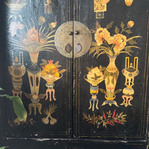 Kaapin alkuperäinen lukko ja avain ovat harvinaisen hyvin säilyneet, mikä viittaa siihen, että esinettä on kohdeltu kunnioituksella sukupolvien ajan. Vaikka alaosa on myöhempi lisäys, kokonaisuus säilyttää 1700‑luvun hääkaappien tyypillisen rakenteen ja arvokkuuden. Huikea kohde!