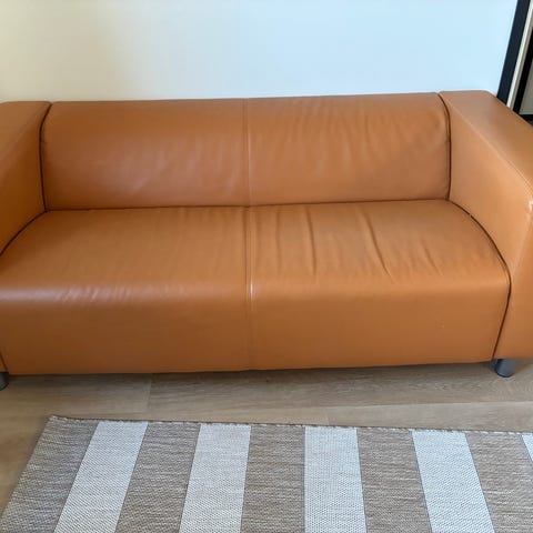 Hyväkuntoinen musta 2-istuttava sohva. Melko kevyt —ei painava rakenteinen kantaa. Ei läikkiä (kuvassa valo heijastaa vaaleat kohdat).