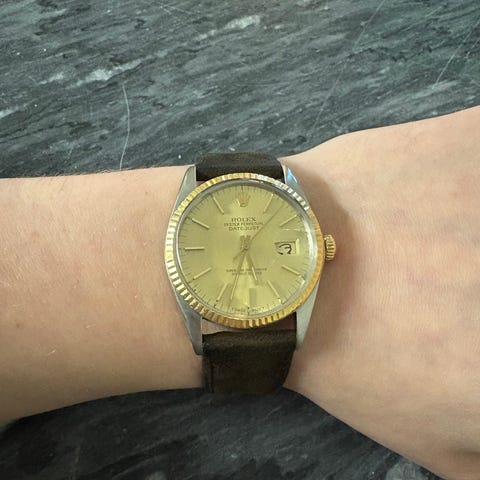 Tarjolle siistissä kunnossa, ensimmäiseltä omistajalta ja juuri huollettuna oleva DJ36. Upealla samppanja tapestry taululla jossa päivyri sekä näyttävät kultaiset osoittimet. Teräksinen kuori jossa erikoisuutena uutena kelloon vaihdettu Turn-O-Graph kehä alkuperäisen fluted kehän tilalle. Kokonaisuuden kruunaa teräs/kulta jubilee-ranneke jossa normaalia iän tuomaa venymää. Koneistona toimii juuri huollettu Rolex 3135 -automaatti. Täydellinen setti jossa kaikki mukaan mitä uutena ostaessa tullut. Kello ostettu uutena kotimaiselta jälleenmyyjältä 1998. Itse kello on T-sarjaa eli valmistunut vuonna 1997. Kello on täyshuollettu 1/2026.