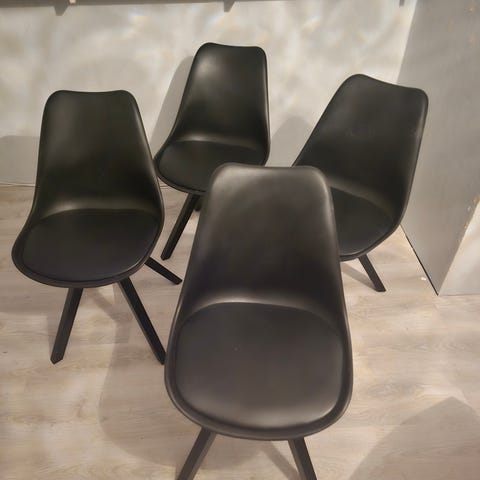 Myydään 4 kpl ruokapöydän tuoleja. Tuolit ovat mustat muovituolit, joissa on musta tekonahkainen istuinpehmuste, puiset jalat. Nämä on aikoinaan ostettu Jyskistä poistomyynnistä. Tuolit ovat siistissä kunnossa, pientä käytönjälkeä havaittavissa muoviosissa mutta yleisilme hyvä ja istuinosat ovat ehjät. Istuinosan koko on 42x39.