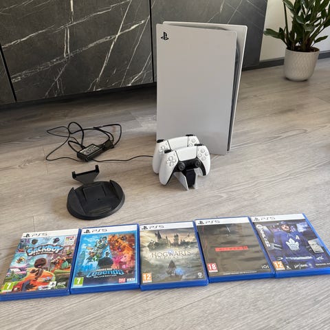 PS5 pelikonsoli levyasemalla, lisäksi hyväkuntoinen dualsense ohjain ja tarvittavat johdot.