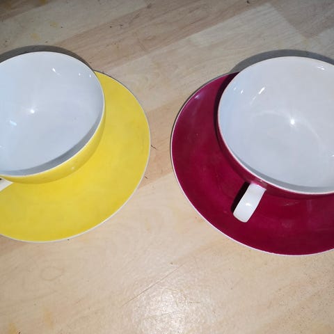 10-osainen kahvikuppisetti, joka sisältää kuppien ja lautasien sarjan. Kuppien ja lautasten pinnassa on kukkakuvioita, jotka ovat väriltään vaaleanpunaisia ja violetteja. Setti sopii kahvin tarjoiluun. Yhdet kuppi ja latanen puuttuu setistä.