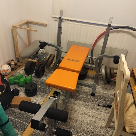 Kokonaisuus kuten kuvassa vie selkäpenkin suuntaisesti tilaa n.210cm ja leveydestä tuon tangon leveyden verran 165cm. Jos hauis/reisitreeni palan ottaa irti tarvittava tila on 150cm