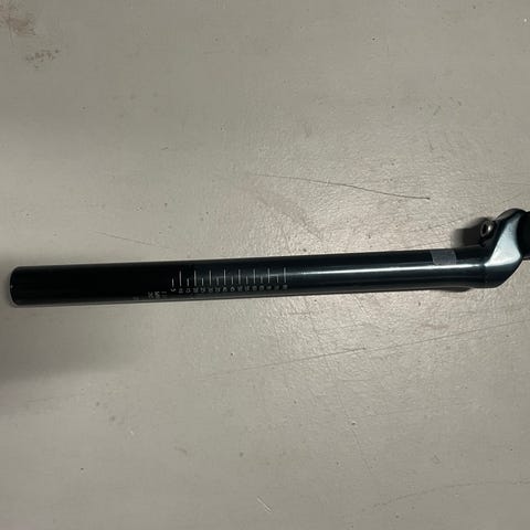 Musta suora satulatolppa 27,2mm. Ollut aikanaan 400mm, mutta lyhennetty noin 350mm mittaan. Alaosassa aika paljon jälkiä.