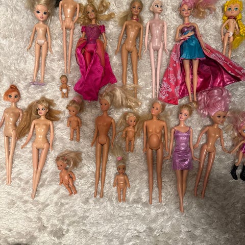 Barbie lastenlelut nuket, Nukilla on pinkit kengät ja ne on suunniteltu lapsille leikkeihin.