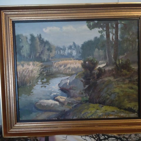 Myydään kaunis, alkuperäinen, Matti Taskisen (1895–1972) maalaama maisemataulu, päivätty -69.