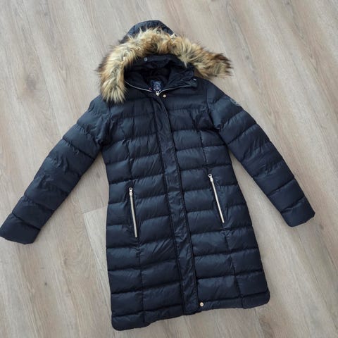 Musta toppatakki, jossa hupussa harmaa karvareunus. Pari nappia irti karvareunuksesta (viimeinen kuva), mutta muuten erittäin hyväkuntoinen.
