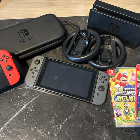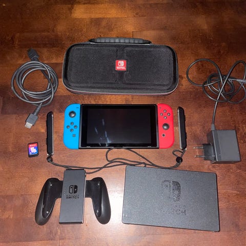 Kohtalaisessa kunnossa oleva Nintendo Switch. Näyttöön on asennettu suojalasi, mutta naarmuja on myös sen alla. Joy coneihin on vaihdettu tatit vanhojen tilalle joten driftaamisesta ei tarvi huolehtia. Mukaan tulee myös 256gb microsd-kortti.