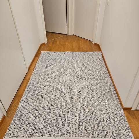 Myydään siisti puna-valkoraitainen matto 100% puuvillaa. Pesu jää ostajalle, vain pieniä tahroja käytön jäljiltä.