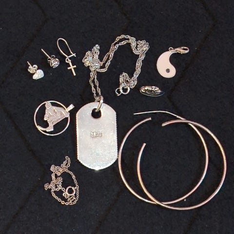 Sekalainen setti vanhoja hopeisia koruja yms. Kaikissa hopeanleimat. Osa on huonokuntoisia. Kuvista saa aika hyvän käsityksen. Paino 20,5g