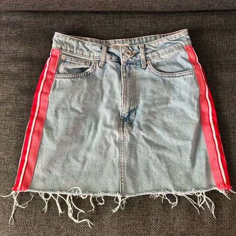 Vaaleansininen kulunut farkkuhame, koko S. Hameessa on koristeellinen valkoinen pitsireunus helmassa, taskut edessä. Pesty hajuttomalla pesuaineella.