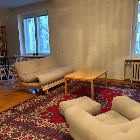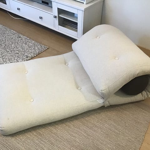 Tyylikkäästä Karup Designin Cube-futontuolista muuntautuu nojatuoli, rahi ja vuode. Pari vuotta käytössä ollut, pientä käytönjälkeä ja tahra, mikä näkyy kuvassa. Nouto Punavuoresta.