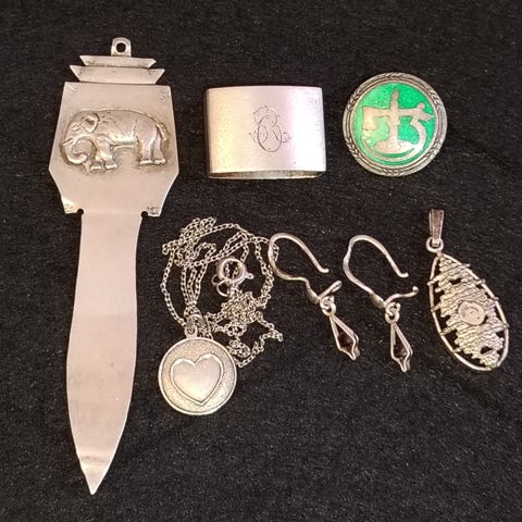 Romuhopeaa ja muutamia ok koruja. Kaikista löytyy jonkinmoiset hopean merkit, mutta en ole varma ovatko kaikki silti aitoja.. Paino 26,8g.