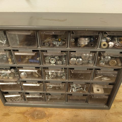 Kaiken näköisiä kiinnikkeitä säilytysrasioissaan. Tarjouksia kuunnellaan mutta postitus ei onnistu.