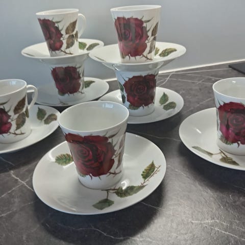 Käyttökuntoiset Arabian kauniit kahvikupit tasseineen. Mukeja 11 kpl ja tasseja 12kpl. Pieniä kulumia voi olla, onhan kyseessä hyvin vanhat mukit 40—50-luvulta