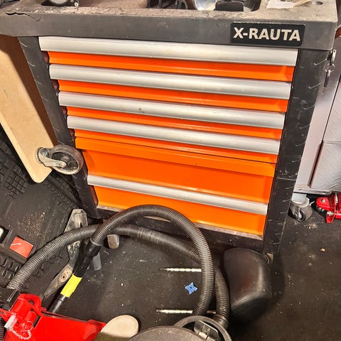Tilava työkaluvaunu jossa paljon säilytystilaa sekä puinen kunnon työtaso. Myydään edelleen motonetissä 379e hinnalla.