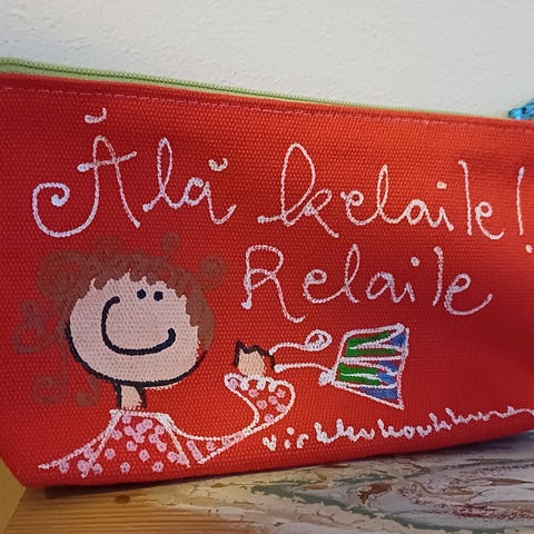 Virkkukoukkuset vetoketjullinen pussukka "Miul on pehmeet aivot kovas käytös" tekstillä.