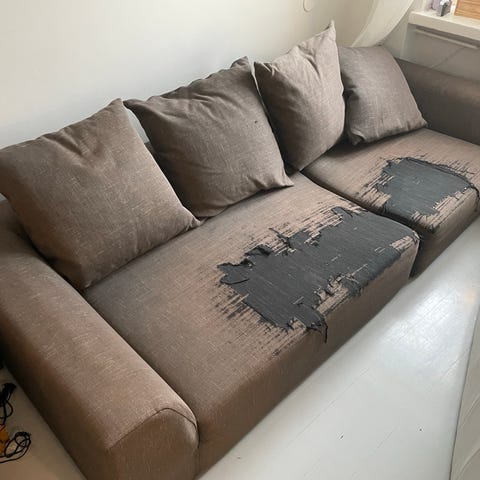 Annetaan sohva vaikka kahvipakettia tai suklaalevyä vastaan <3 Päällisistä divaaniosan kangas sekä selkäytyynyjen kankaat viimeisimpänä pesty, kaksi muuta istuintyynyä ei. Divaaniosiossa kahvitahra (kts kuva). Varmasti kangaspesurilla lähtee pahimmat liat! Niskatyynyn saa myös pois/siirrettyä.