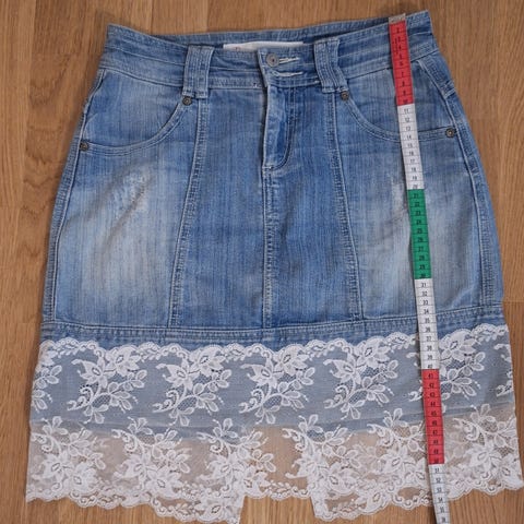 KappAhlin farkkuhame, koko XS. Taskut edessä ja takana, vetoketju edessä. Sivussa laskokset. Pituus 53 cm. Pesty hajusteettomalla pesuaineella, siisti.