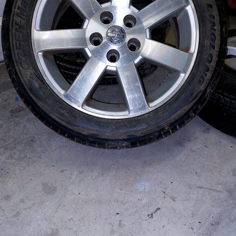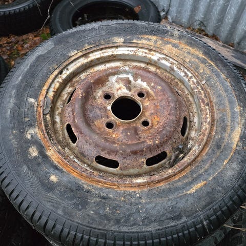 Orignaali Nissan aluvnteineen, hyvät nastat, Nissan Jukessa olleet renkaat. Nähtävissä Luodon siirtolapuutarha-alueella.
