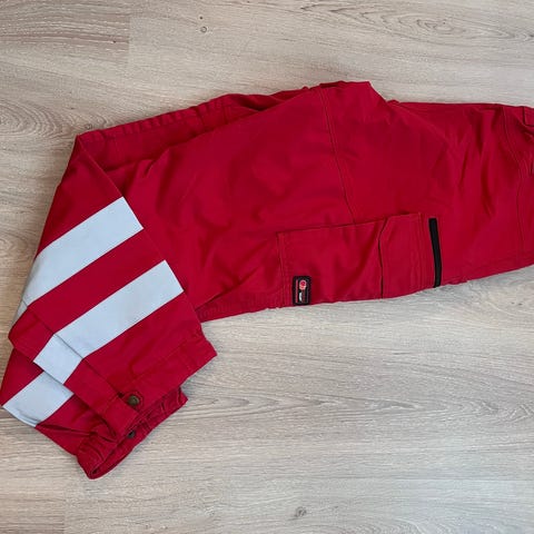 Punaiset ensihoidon työhousut, koko: 156. Valmistaja ruotsalainen Eripio Workwear. Täysin ehjät ja siistit, ei havaittavissa kulumaa.