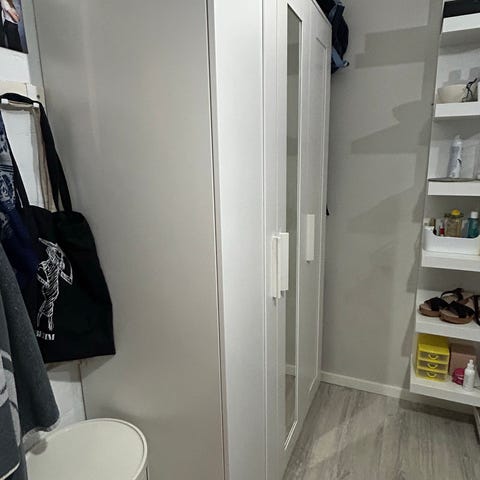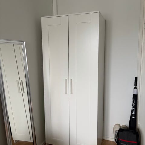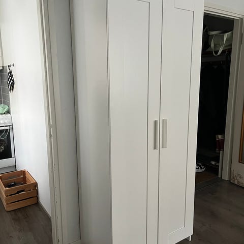 Hyväkuntoinen Ikea Brimnes-vaatekaappi, ei naarmuja eikä kolhuja. Mitat löytyy kolmannesta kuvasta. Kuvassa oleva kaappivalo kaupan päälle 🙂 Lemmikkikoti (koira+kissa)