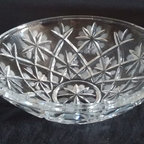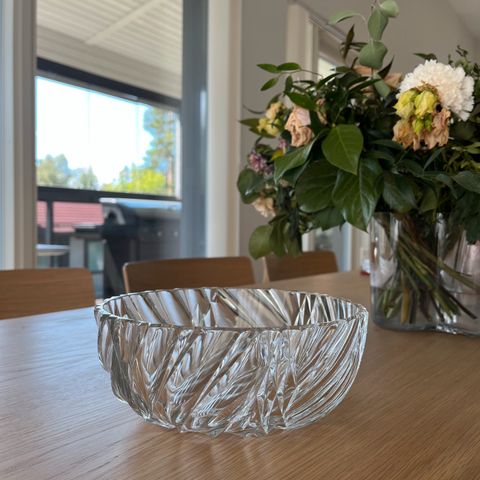 Tyylikäs kristallikulho, jossa on geometrinen leikkauskuvio. Kulho on valmistettu kirkkaasta lasista, ja sen muotoilu korostaa valon taittumista kauniisti.