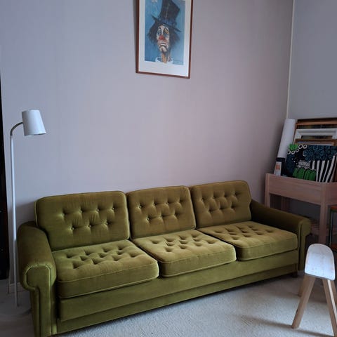 Penkissä on havaittavissa hieman käytön jälkiä, kuten pieniä naarmuja puupinnoissa ja kulumaa verhoilussa. Yleisilme on kuitenkin siisti ja rakenne tukeva. Tämä on oiva valinta, jos etsit persoonallista ja kestävää istuinratkaisua.