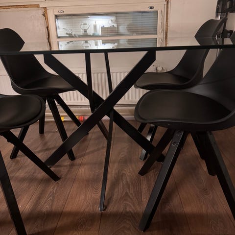 Tyylikäs Ikea Glivarp malliston moderni ruokapöytä, jossa on lasinen pöytälevy ja metalliset jalat. Pöytä on laajennettavissa keskeltä mekanismilla, mikä tekee siitä käytännöllisen valinnan erilaisiin tilaisuuksiin ja tiloihin. Lasipinta tuo keveyttä ja avaruutta huoneeseen, kun taas metallirunko antaa sille tukevuutta ja kestävyyttä. Käytön jälkiä pöydässä ja lisäksi pintalikaa lasin ja rungon väleissä, joka voi vaatia puhdistusta.