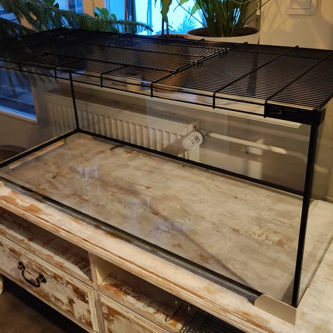 100x40x40 lasiterraario. Ollut noin 2vuotta käytössä. Kaksi halkeamaa lasissa terraarion yläreunassa. Muuten hyvässä kunnossa ja siisti.
