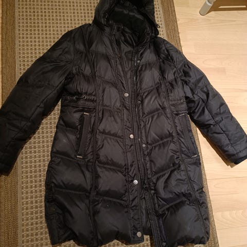 Kuvanmukainen kevyt untuvatakki Koko L. Kainalo-Kainalo 60cm. Olkapää-helma n. 75cm takaa hieman pitempi.