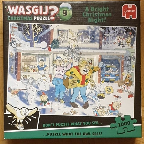 Joulukalenterien joka luukusta tulee pieni 54 palan palapeli, jonka kuva on yllätys. Palat omissa pikku pusseissaan. Wasgij-kalenterin luukut 2 ja 12 auenneet yhdessä, katso kuva.