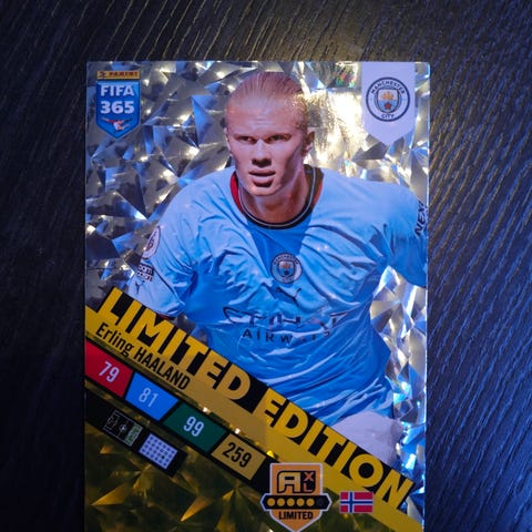 Panini Erling Haaland Manchester City keräilykortti, jossa on pelaajan kuva ja tilastotietoja kaudelta 2022. Kortti esittelee Erling Haalandin suorituksia ja on osa Paninin keräilykorttisarjaa.