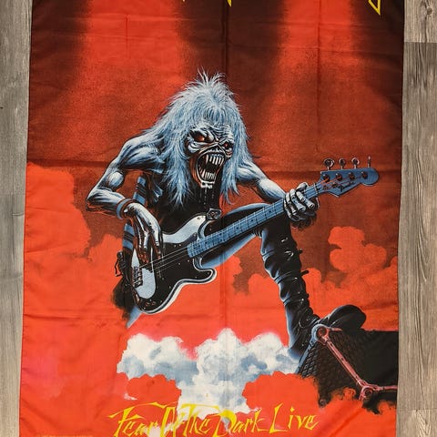 Iron Maiden kangasjuliste vuodelta 1996, jossa on yhtyeen jäsenien kuvitus ja tummat värit. Juliste soveltuu seinäkoristeeksi musiikin ystäville.
